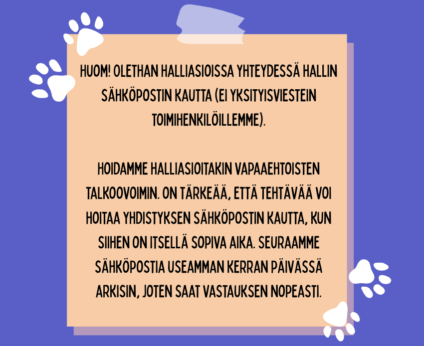 Toivomme ymmärrystä, sillä hallipostia ylläpitävät omat jäsenemme, jotka hoitavat yhdistyksemme asioita oman vapaa-aikansa puitteissa.
