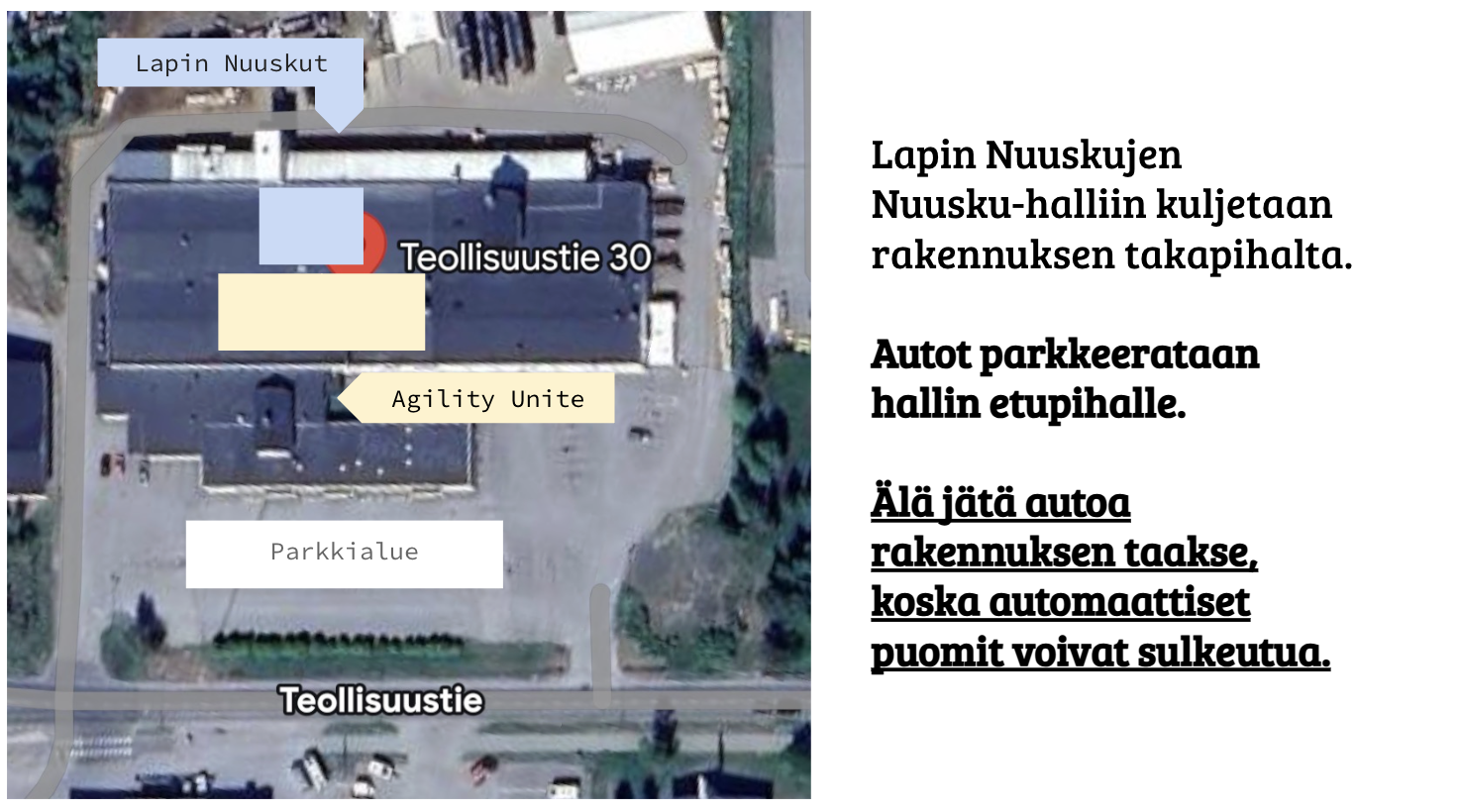 Hallilla pyörii lajikohtaisia ohjattuja ja avoimia treenivuoroja viikoittain sekä järjestetään kursseja. Halli muuttaa 1.10.25 alkaen Rovaniemen teollisuusalueelle osoitteeseen Teollisuustie 30, 96300 Rovaniemi. Nuusku-hallin pohja on tekonurmea noin 430 neliön treenialalla, jossa on täyteaineena kumirouhe, mikä tuo pohjaan pitoa. Nurmi on asennettu suoraan lattian päälle, eikä sen alla ole erillistä joustoalustaa. Kuvia hallista ja ohjeet halliin saapumiseen löytyvät tämän sivun alaosasta. Voit tutustua hallin käytäntöihin myös instagramissa @lapinnuuskutry kohokohdissa. Hallin toiminta suunnitellaan ohjattu toiminta etusijalla.